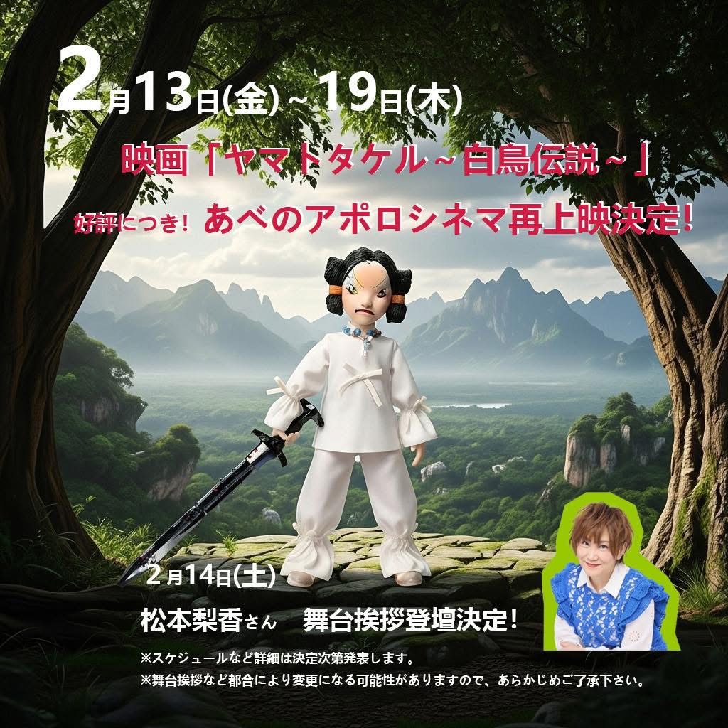 2年がかりで昨年ようやく完成に漕ぎ着けた、映画『ヤマトタケル~白鳥伝説~』。好評につき昨秋完成上映を行った大阪あべのアポロシネマさんで来月2月13日(金)〜19日(木)の間、追加上映が決まりました(上映延長の可能性もあり)❗️14日(土)は特別会として、東京から主人公ヤマトタケル役の人気声優・松本梨香さんもお呼びして舞台挨拶を行います。特別会の前売りチケットは今月1月30日(金)23時からあべのアポロシネマホームページよりご購入頂けます❗️詳しくは下記をご覧下さいませ〜🙇‍♀️